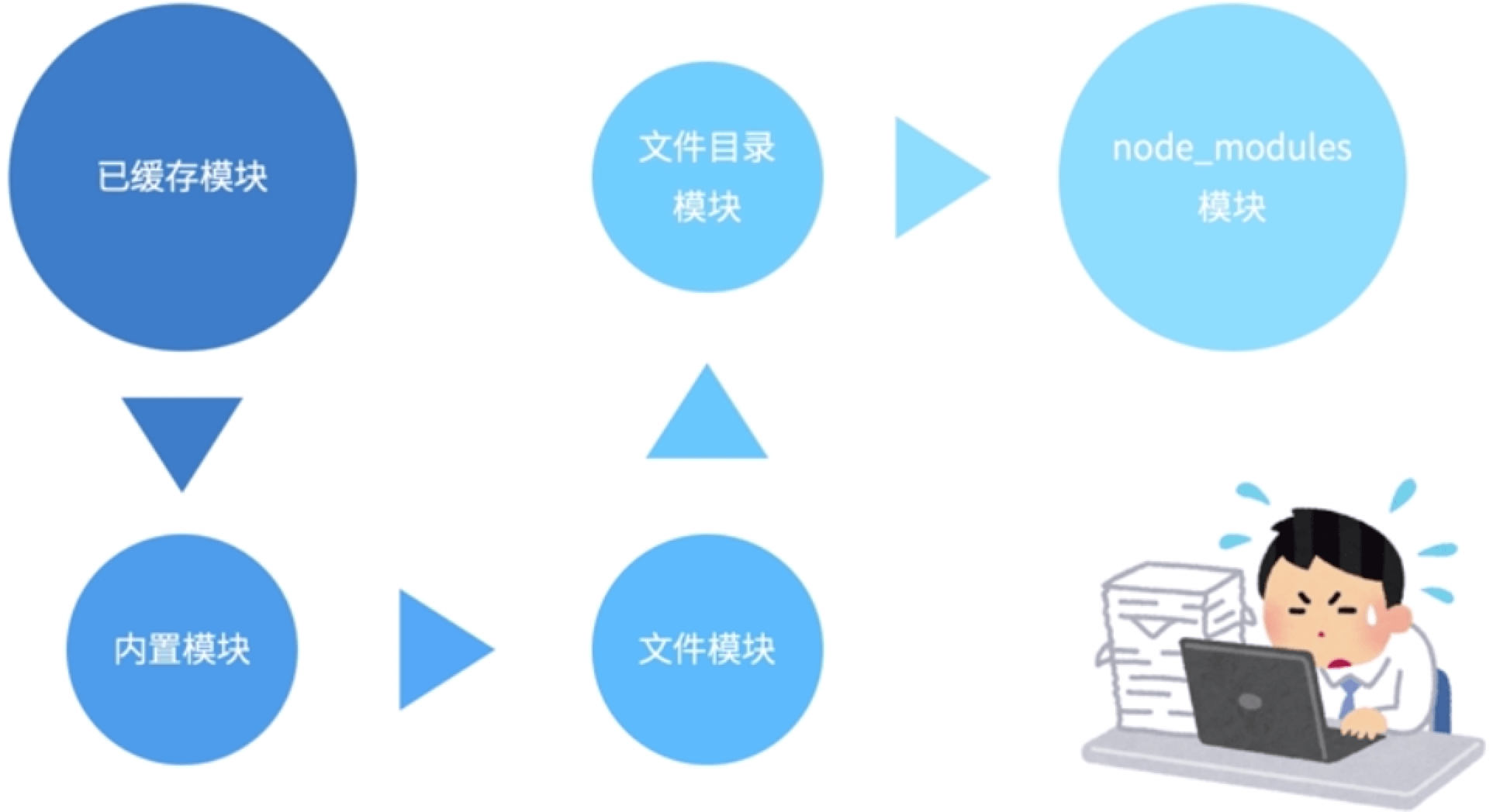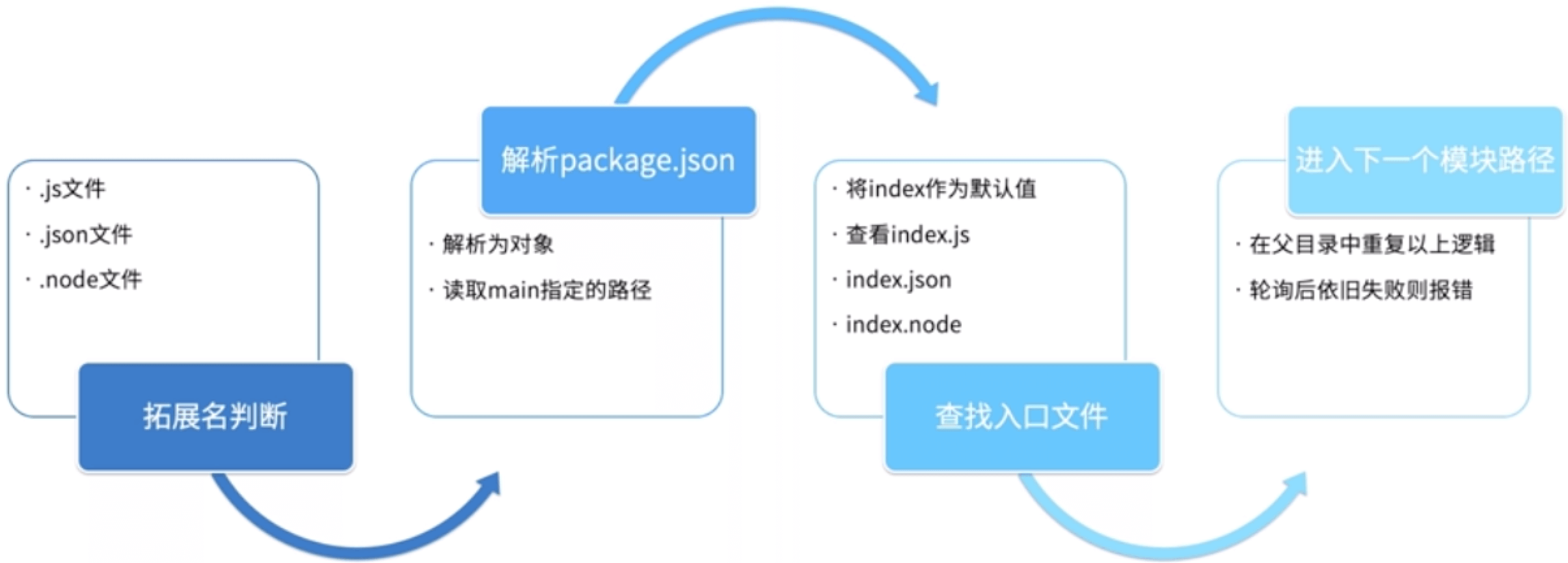 在node处理模块加载的时候,还有缓存的概念,就是说缓存中存在了,就直接返回;内置模块直接加载;根据找到文件创建新的模块并缓存。